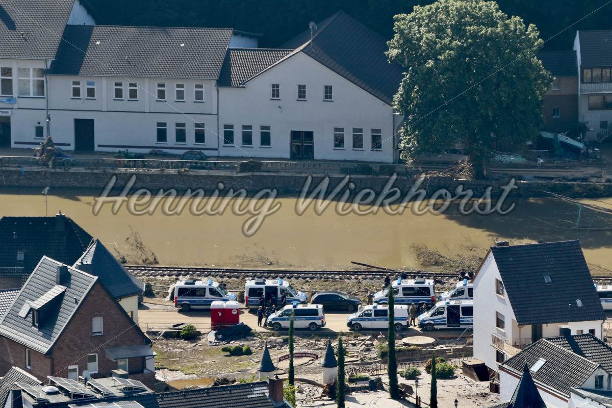 Einsatzfahrzeuge am Ahr-Ufer in Dernau