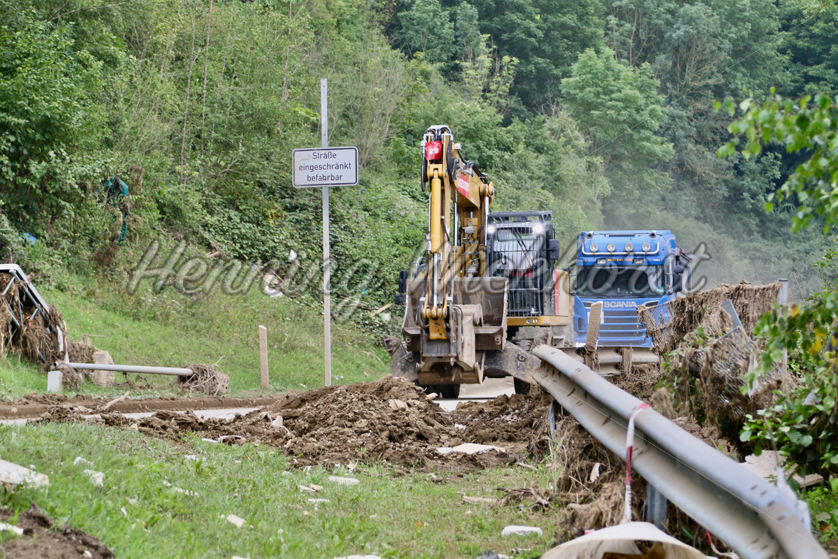 Bagger und Laster im Ahrtal zwischen Kreuzberg und Ahrbrück drei Wochen nach der Flutkatastrohe vom 14. Juli 2021