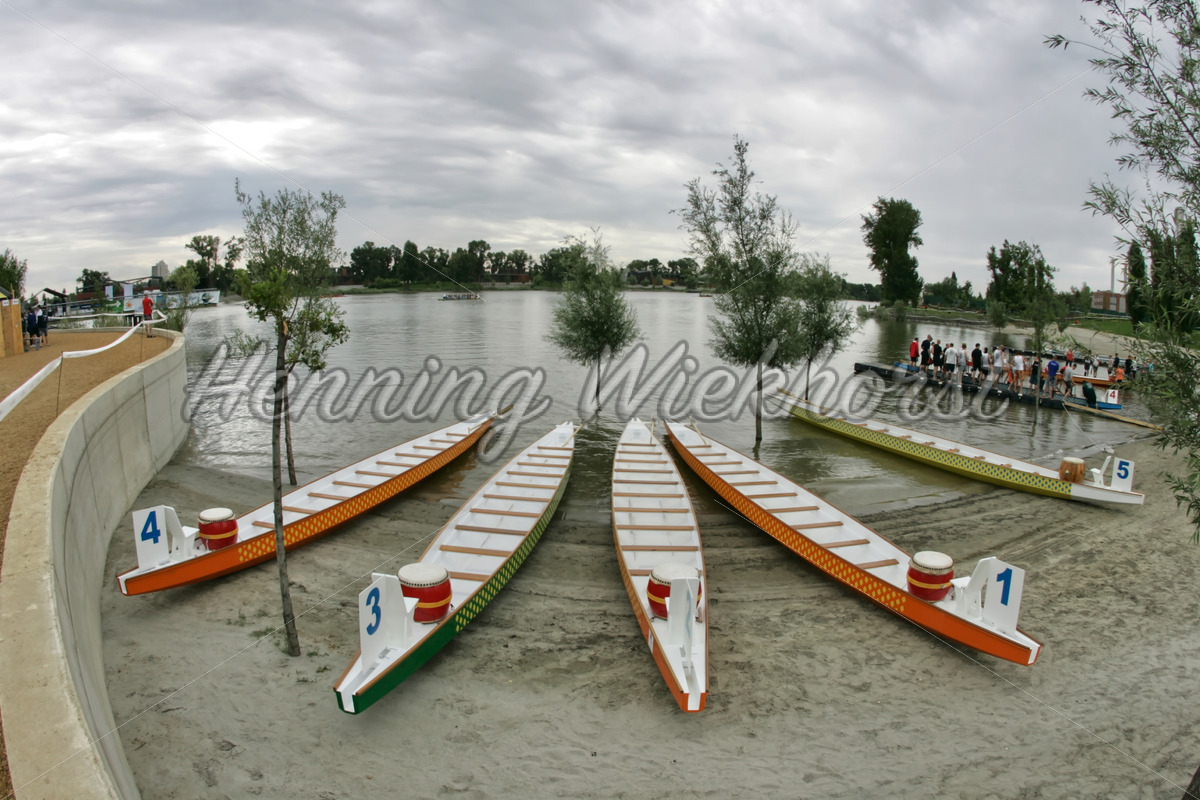 Drachenboote am Strand der Donau