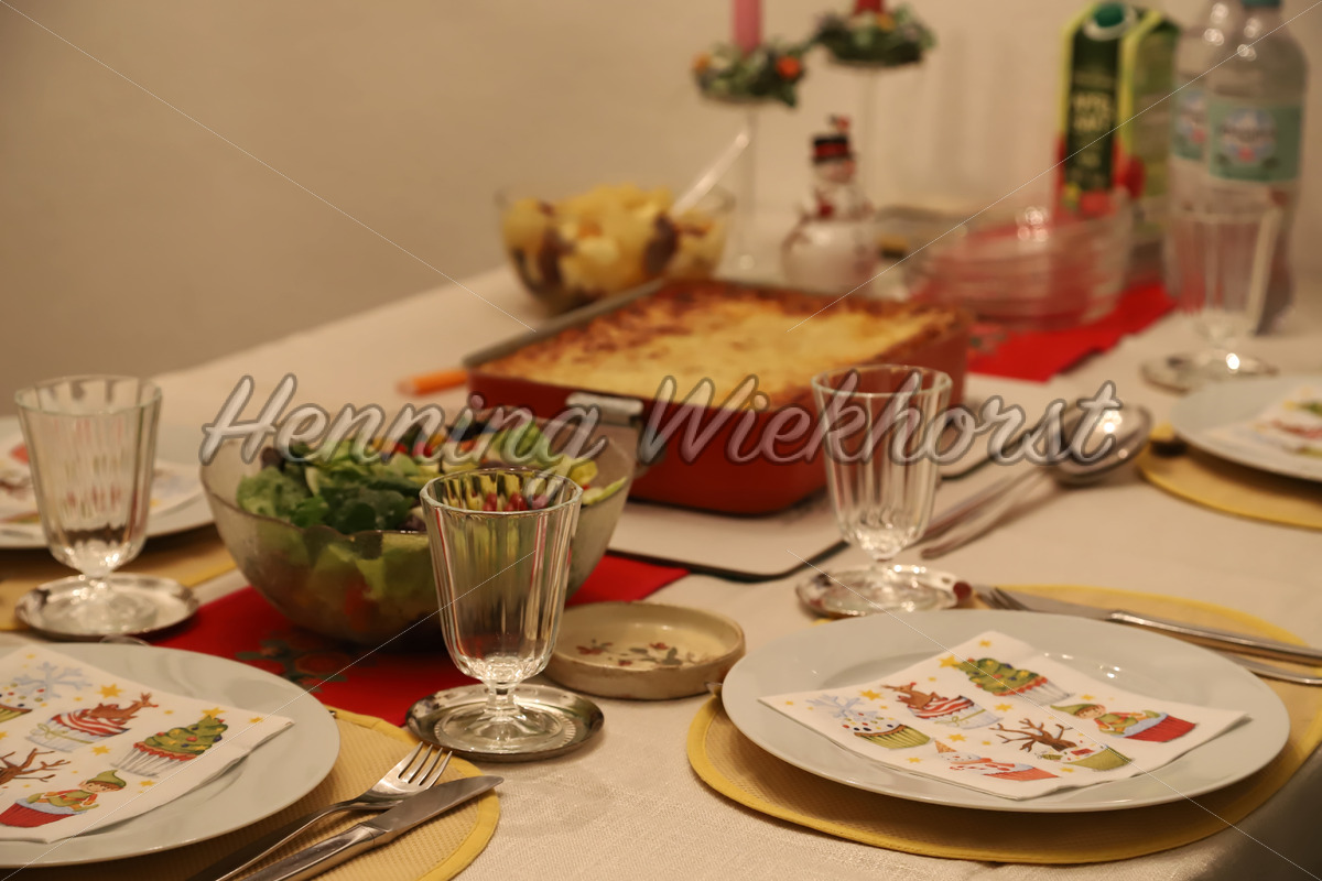 Festlich gedeckter Tisch wie zu Weihnachten – Lasangne und Salat