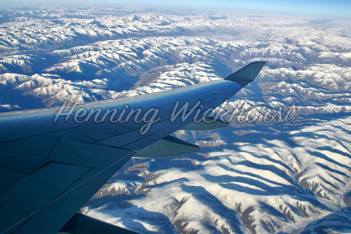 Fliegen über einem Gebirge auf dem Weg von Beijing nach Hong Kong