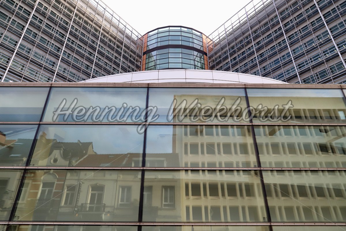 Abstrakter Blick nach oben, dicht am Gebäude der EU Kommission in Brüssel stehend.
