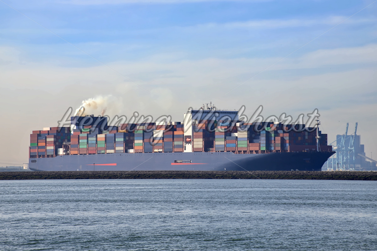 Ein grosses Container-Schiff verlässt den Hafen von Rotterdam.