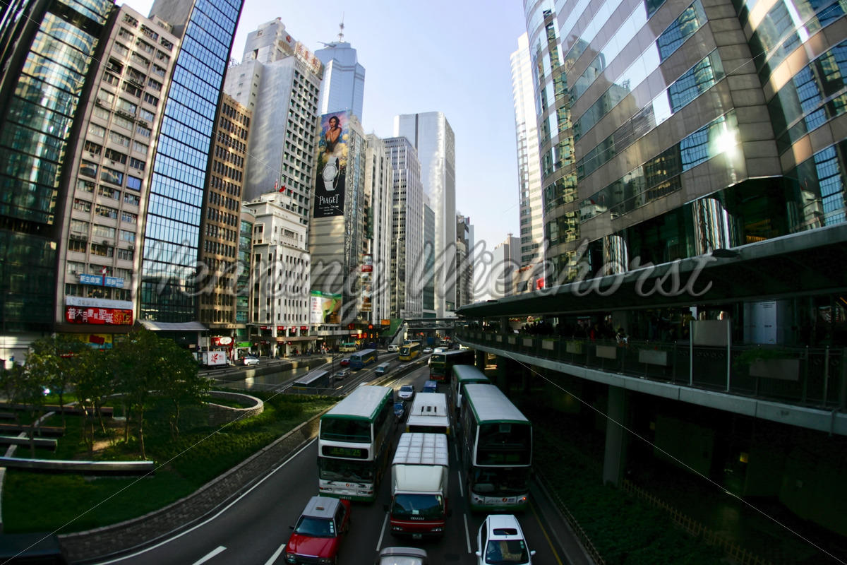Dichter Verkehr zwischen Hochhäusern in Hong Kong – Central District