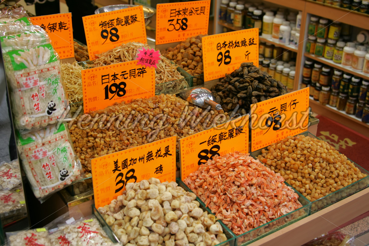 Getrocknete Meeresfrüchte in der Auslage eines Geschäftes in Jordan auf der Kowloon-Seite von Hong Kong.