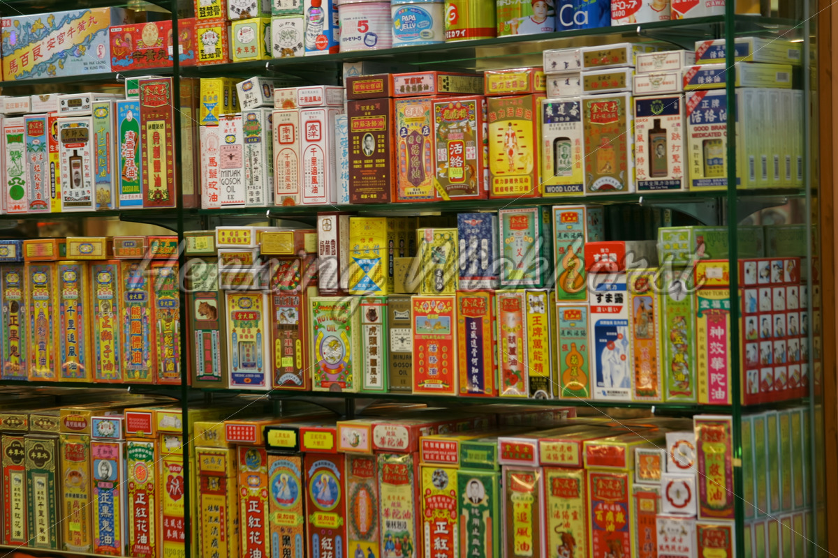 Chinesische Heilmittel im Regal eines Geschäftes in Jordan auf der Kowloon-Seite von Hong Kong.