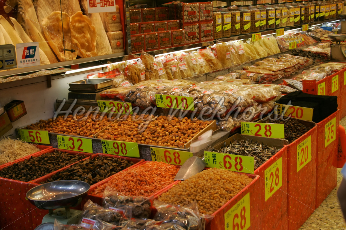 Getrocknete Meeres-Spezialiäten in einer Geschäftsauslage in Yau Ma Tei auf der Kowloon-Seite von Hong Kong.