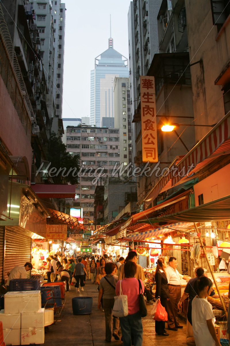 Markt zwischen Hochhäusern in Wan Chai auf Hong Kong Island