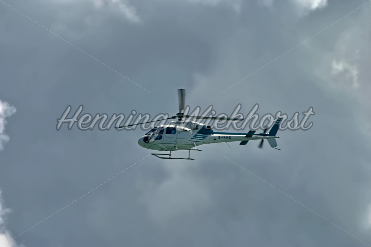 Hubschrauber vor dunklen Wolken