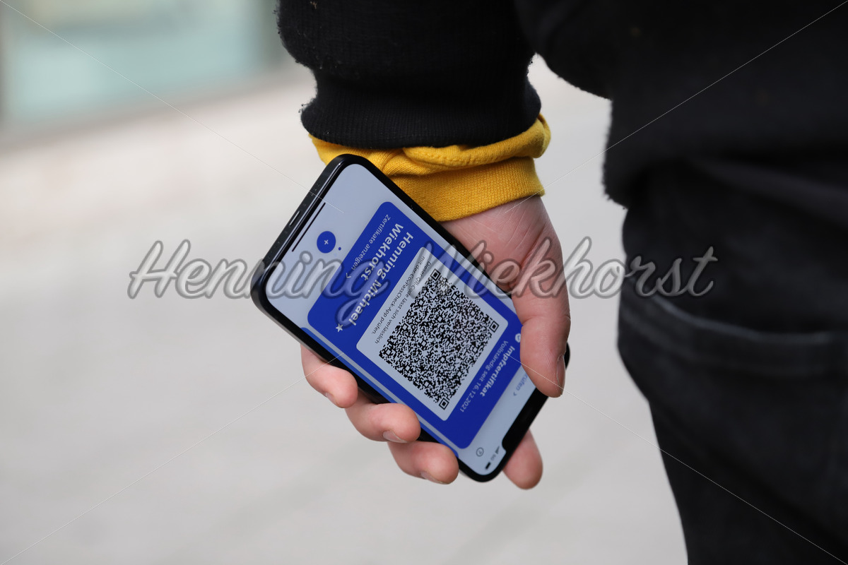 Das Smartphone in der Hand eines jungen Mannes zeigt die im Bildschirm die Corona-App des RKI. Der erkennbare Name ist der des Fotografen. Gleiches gilt für den QR-Code, der verändert und somit unbrauchbar gemacht wurde.