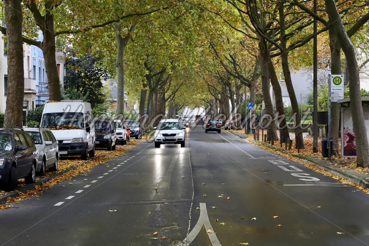 Verkehr auf nasser Strasse unter Bäumen in der Stadt im Herbst.
