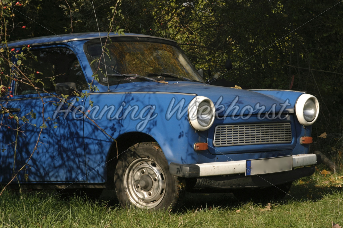 Klassischer Trabant in blau mit weißer Stoßstange