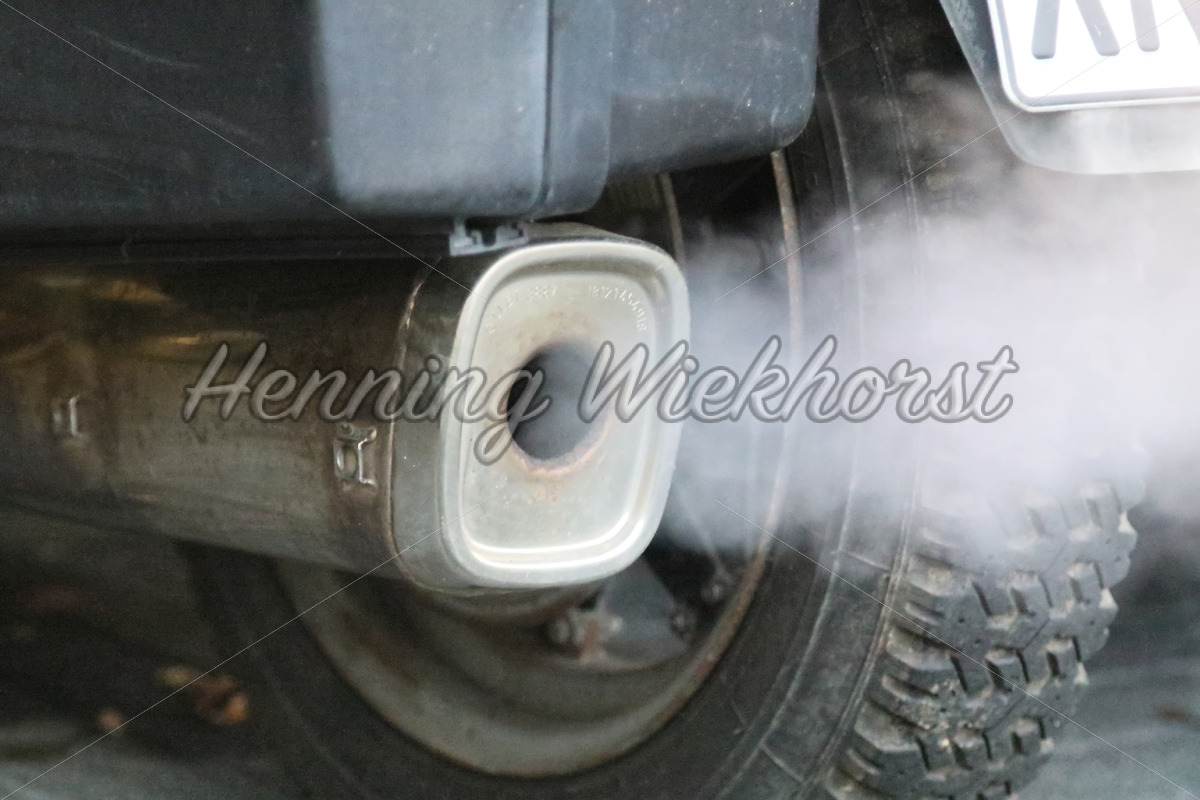 Kondensierende Abgase aus einem Motorradauspuff bei kaltem Wetter.