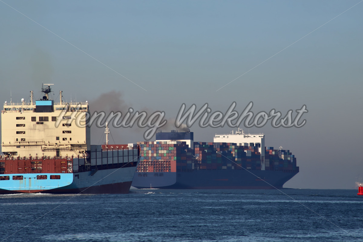 Das vorausfahrende Schiff verschmutzt die Luft, das andere fährt sauber von Rotterdam in die Nordsee.