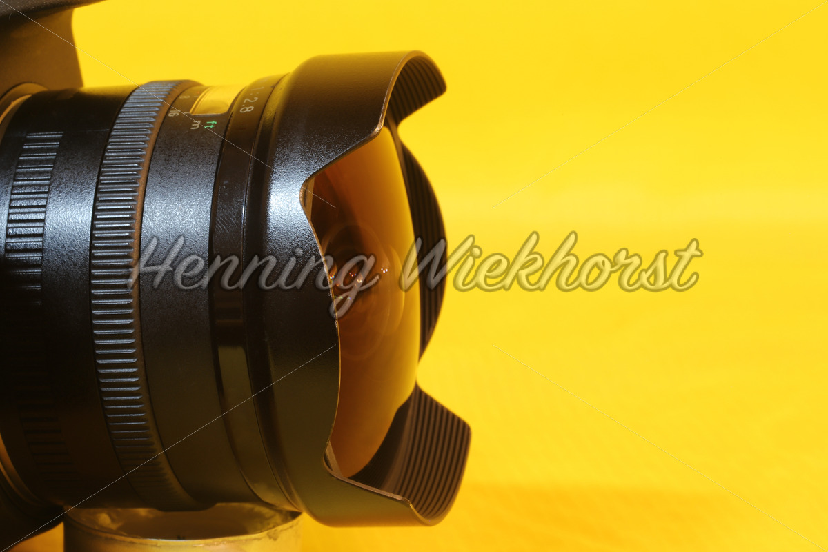 Schwarzes Fischaugen-Objektiv vor grell-gelbem Hintergrund
