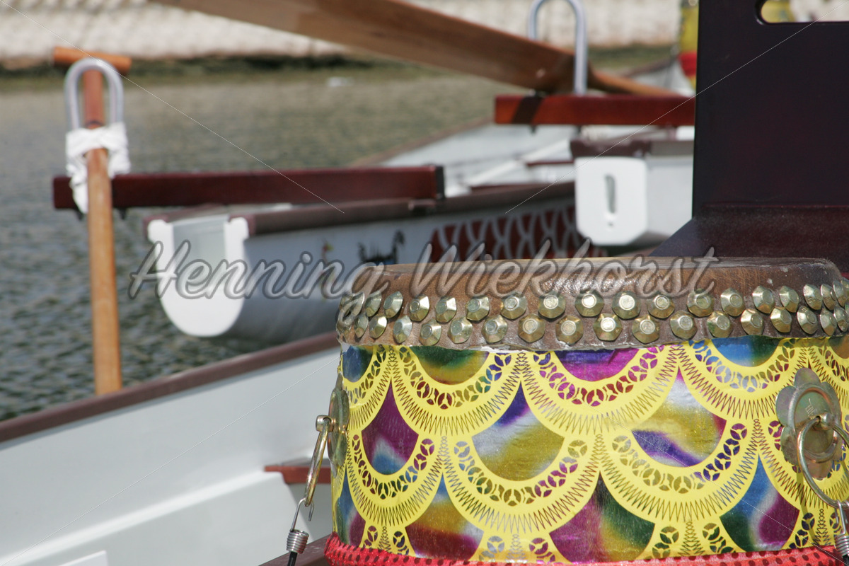Trommel auf Wettkampf-Drachenboot: Fotografiert auf den European Club Crew Championships (ECCC) der European Dragon Boat Federation (EDBF) 2019 in Sevilla / Spanien.