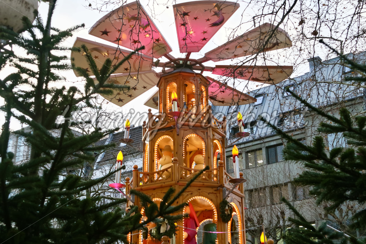 Weihnachtspyramide zwischen Tannen auf dem Markt in Bonn